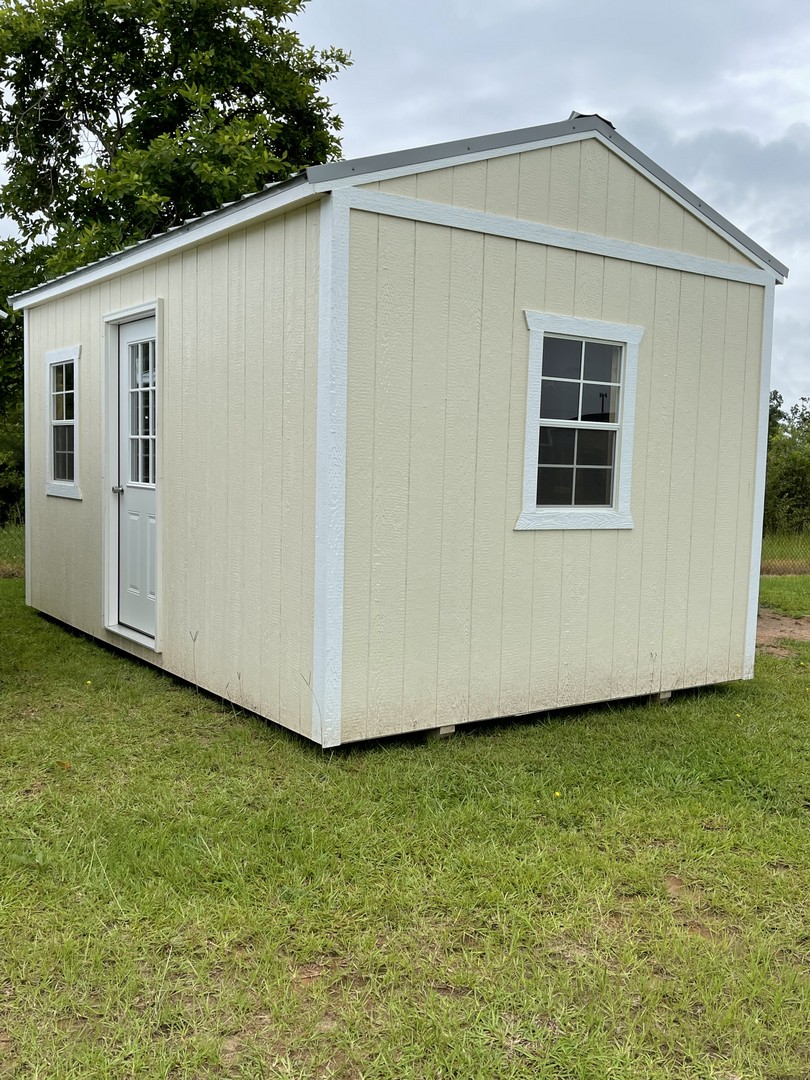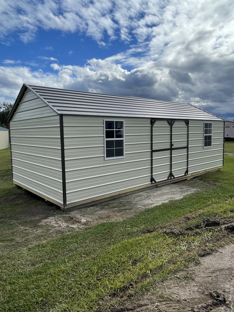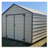 The economy metal utility comes with a 5 year warranty. Available sizes 8x12 through 12x32. This is our most economical building option. These buildings are great for storage, tool sheds, and lawn equipment. Built locally in Montezuma, Ga. Our goal is to offer you a quality product at a reasonable price. Economy Metal Buildings come in Sandstone on the roof and Sides. With your pick of a trim color. Options are not available for this model.